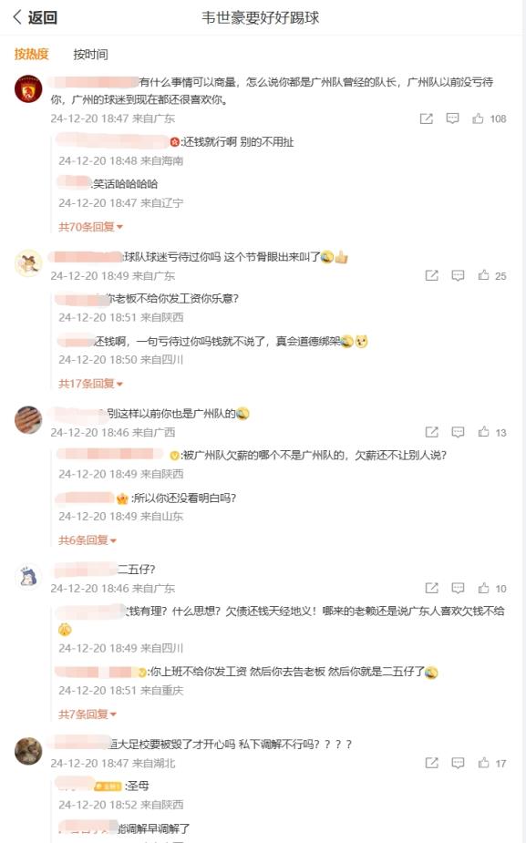 在韋世豪的微博評論區(qū)下充斥著兩種聲音,一種認(rèn)為韋世豪當(dāng)初也是廣州隊隊長,有什么事可以商量,另一種則認(rèn)為俱樂部欠債還錢天經(jīng)地義。你怎么看?